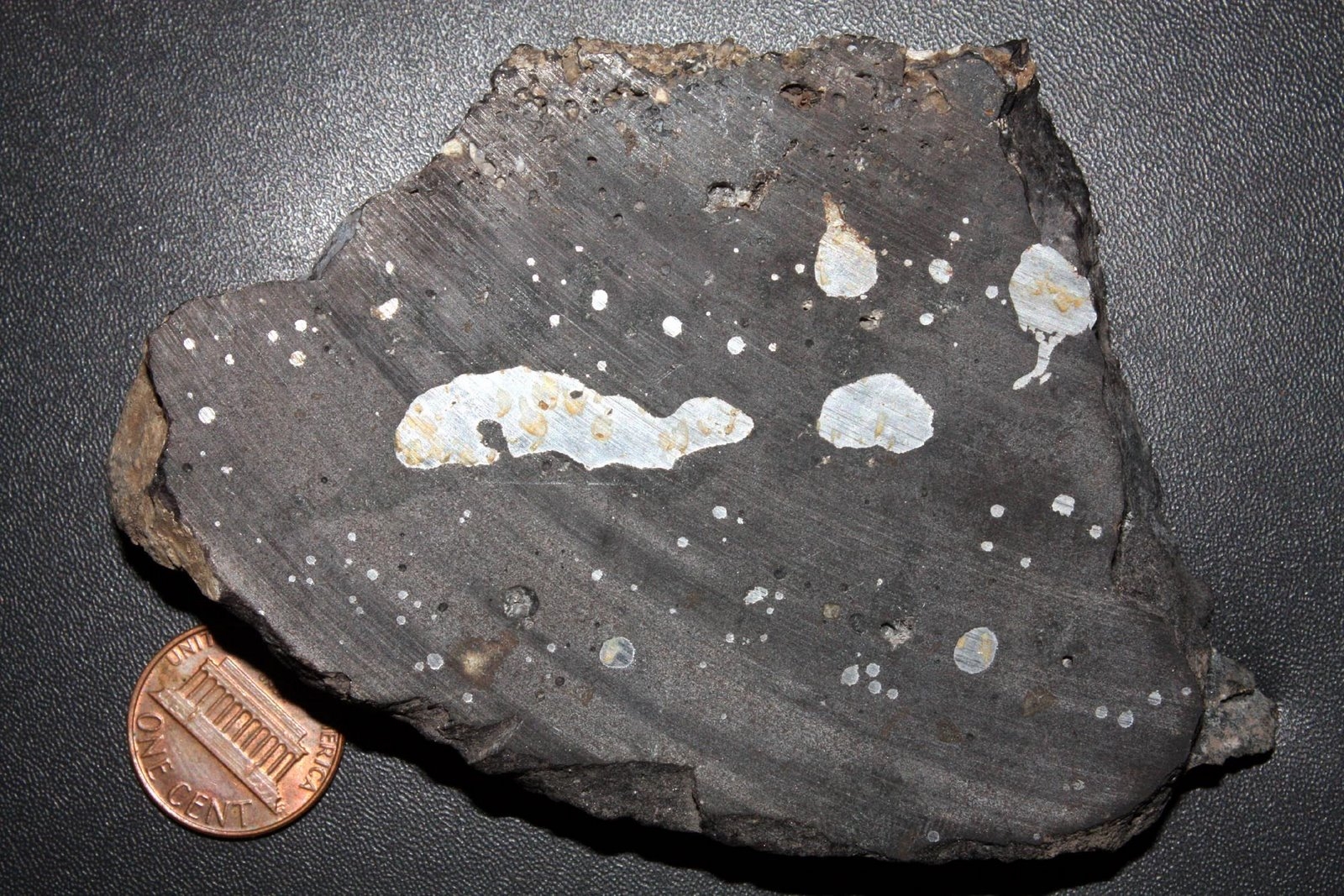 The author knew that the sectioned slab pictured below could not be iron-furnace slag because of the large metallic-iron inclusions, and jumped to the conclusion that this material was the chemically-reduced igneous crust of a hot-classical Kuiper belt object that impacted Earth as the YD-impact comet on the Laurentide ice sheet, 12,800 years ago, and was delivered to Central Pennsylvania, embedded in a ballistic ice-sheet fragment. Instead, the author now understands that the pictured material is merely industrial lead-silver slag, where metallic-iron is part of the waste stream of lead-silver smelting.
